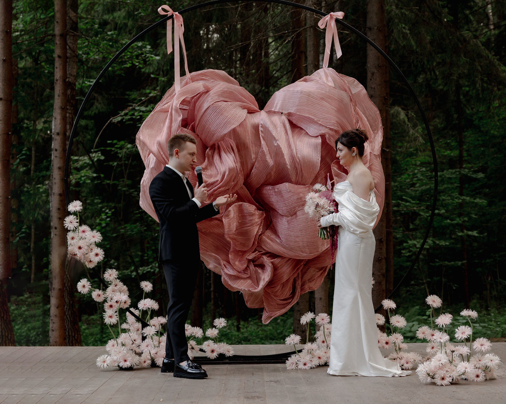 Диана и Лёша — творческая душа и тонкий кадр. Они оба пришли из мира кино, и их свадьба стала настоящим авторским фильмом — наполненным светом, символами и глубиной чувств. Сердце-арка среди леса — не просто декор, а метафора их любви: чистой, живой, естественной, как сама природа. ⠀ Каждая деталь была будто сценой: мягкий свет сквозь листву, лёгкий ветер в волосах, искренние клятвы, звучащие в тишине. ⠀ Я словно попала в киноленту, где сюжет писал не сценарист, а чувства. Спасибо, что доверили быть рядом в этот день — одну из самых душевных и незабываемых свадеб этого года.